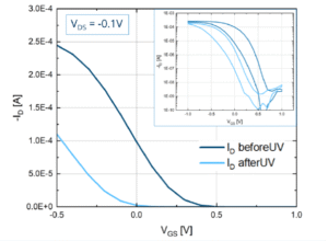 The challenge in developing the organic electrochemical transistors for the classification task is to be able to adjust the threshold voltage for low power operation and for cascading devices. To this end, we have worked on shifting the threshold voltage of PEDOT:PSS transistors using UV light.